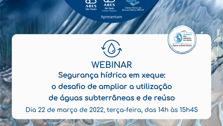 A Associação Brasileira de Engenharia Sanitária e Ambiental – Seção São Paulo (ABES-SP), por meio de sua Câmara Técnica de Recursos Hídricos e da Subseção Centro Paulista, promoverá, na próxima terça-feira, 22 de março, Dia Mundial da Água, às 14h, o Webinar Segurança hídrica em xeque: o desafio de ampliar a utilização de águas subterrâneas e de reuso. Clique aqui para conferir a programação completa e se inscrever.