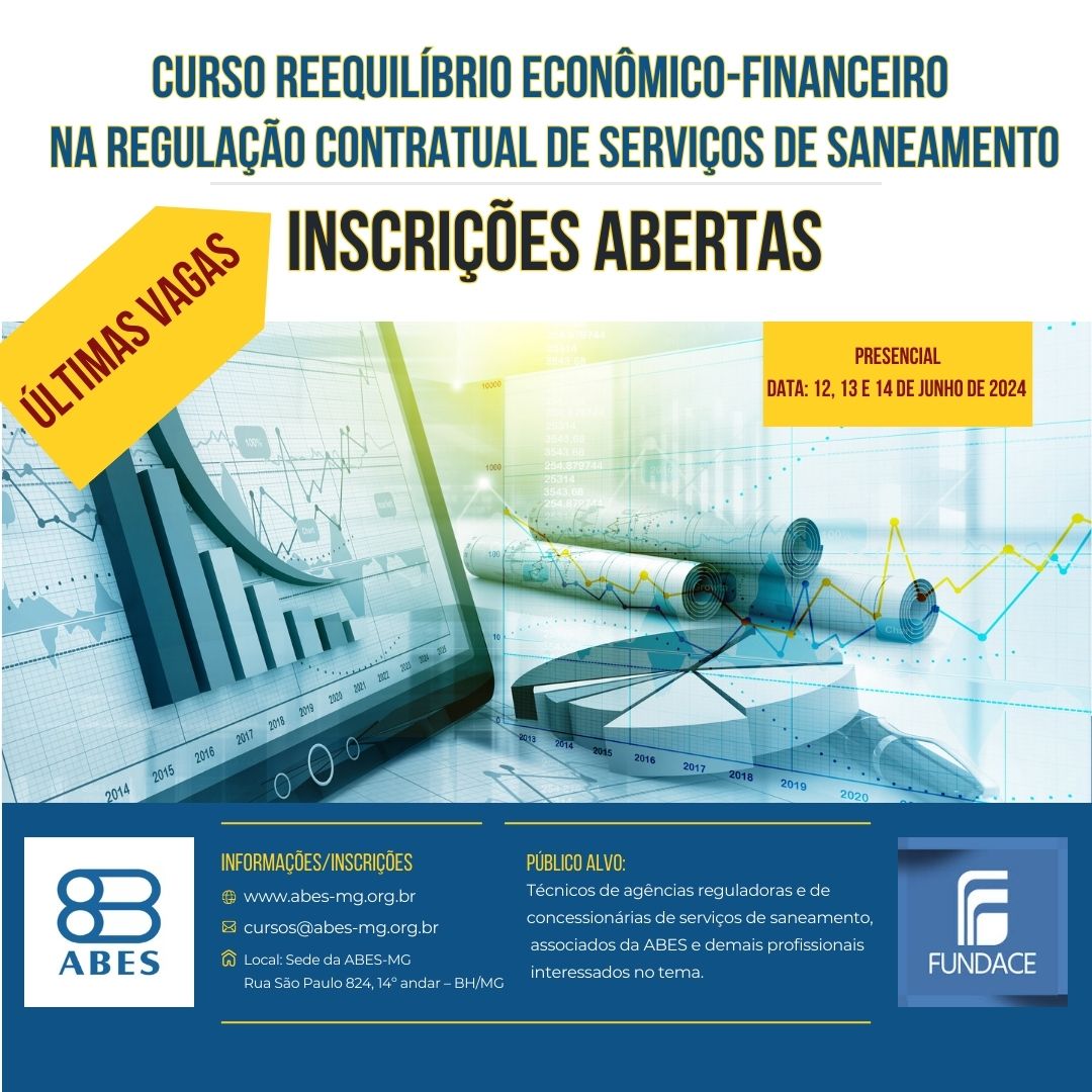O curso “Reequilíbrio Econômico-Financeiro na Regulação Contratual de Serviços de Saneamento” será presencial, na sede da ABES-MG, localizada na Rua São Paulo 824, 14º andar, em Belo Horizonte, nos dias 12, 13 e 14 de junho, de 9h às 12h e das 14h às 17h.