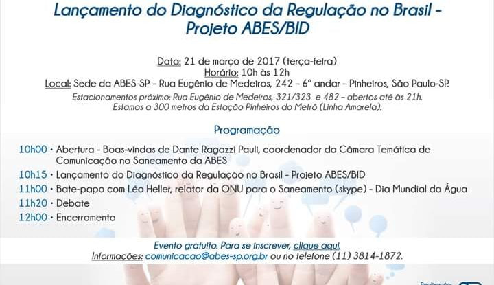 A Câmara Temática de Comunicação no Saneamento da ABES, coordenada por Dante Ragazzi Pauli, promoveu nesta terça, dia 21 de março, às 10h, na sede da ABES-SP, o lançamento do Diagnóstico da Regulação no Brasil, fruto do Projeto ABES/BID, uma parceria entre a ABES e o Banco Interamericano de Desenvolvimento.