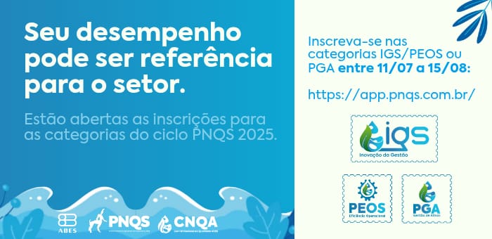 O momento de reconhecer a excelência do seu trabalho chegou! Estão abertas as inscrições para o novo ciclo do Prêmio Nacional da Qualidade em Saneamento – PNQS 2025, nas categorias IGS/PEOS e PGA.