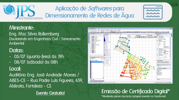O programa Jovens Profissionais do Saneamento da ABES Seção Ceará (JPS–CE) retomará suas atividades, em Fortaleza, com a realização de uma palestra com o tema “Aplicação de Softwares para Dimensionamento de Redes de Água”. O evento, que terá como palestrante o engenheiro Silvio Rollemberg, ocorrerá na próxima quarta-feira, dia 5 de julho, às 19h, e no sábado, dia 8, às 8h da manhã, na sede da ABES-CE. A participação é gratuita.