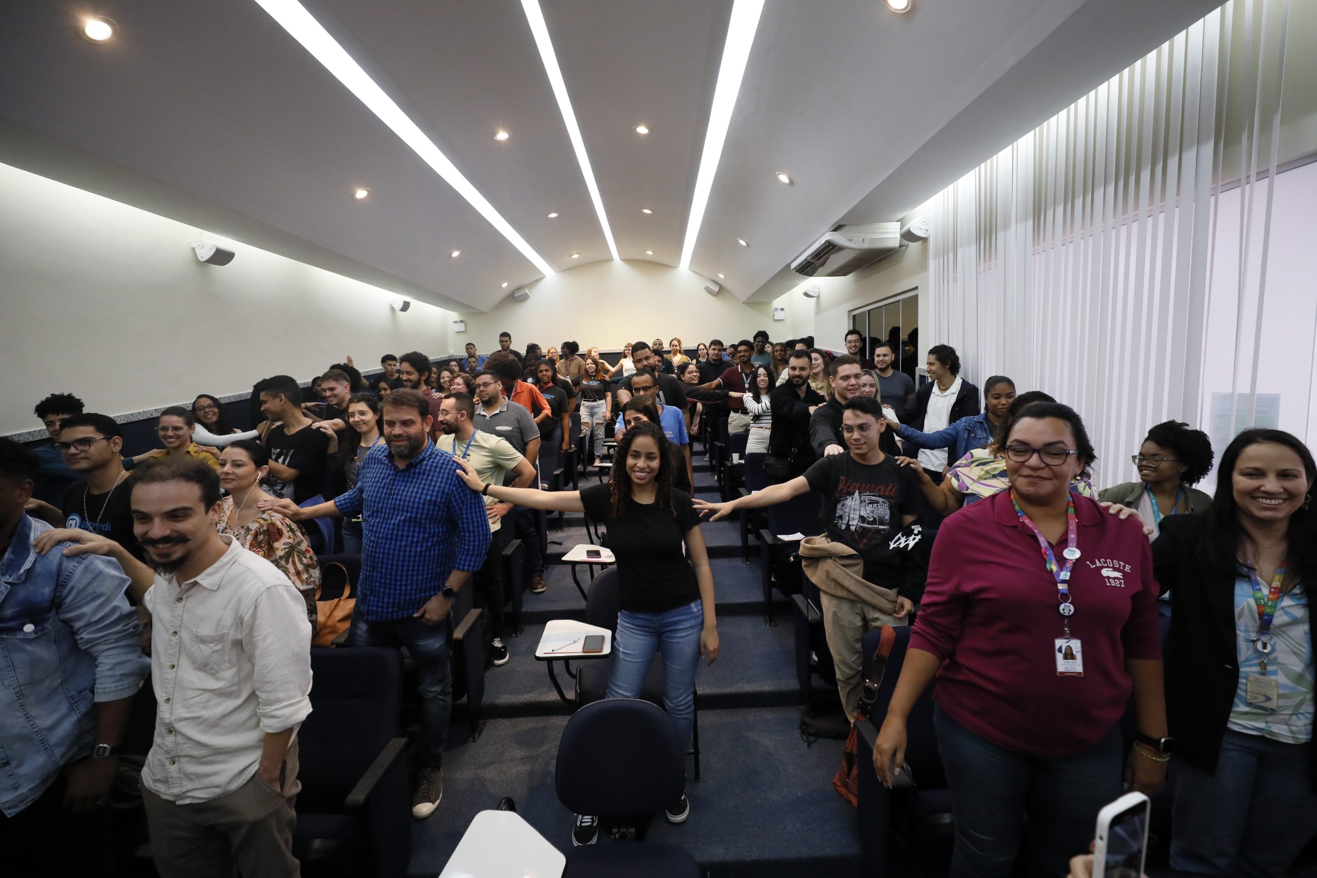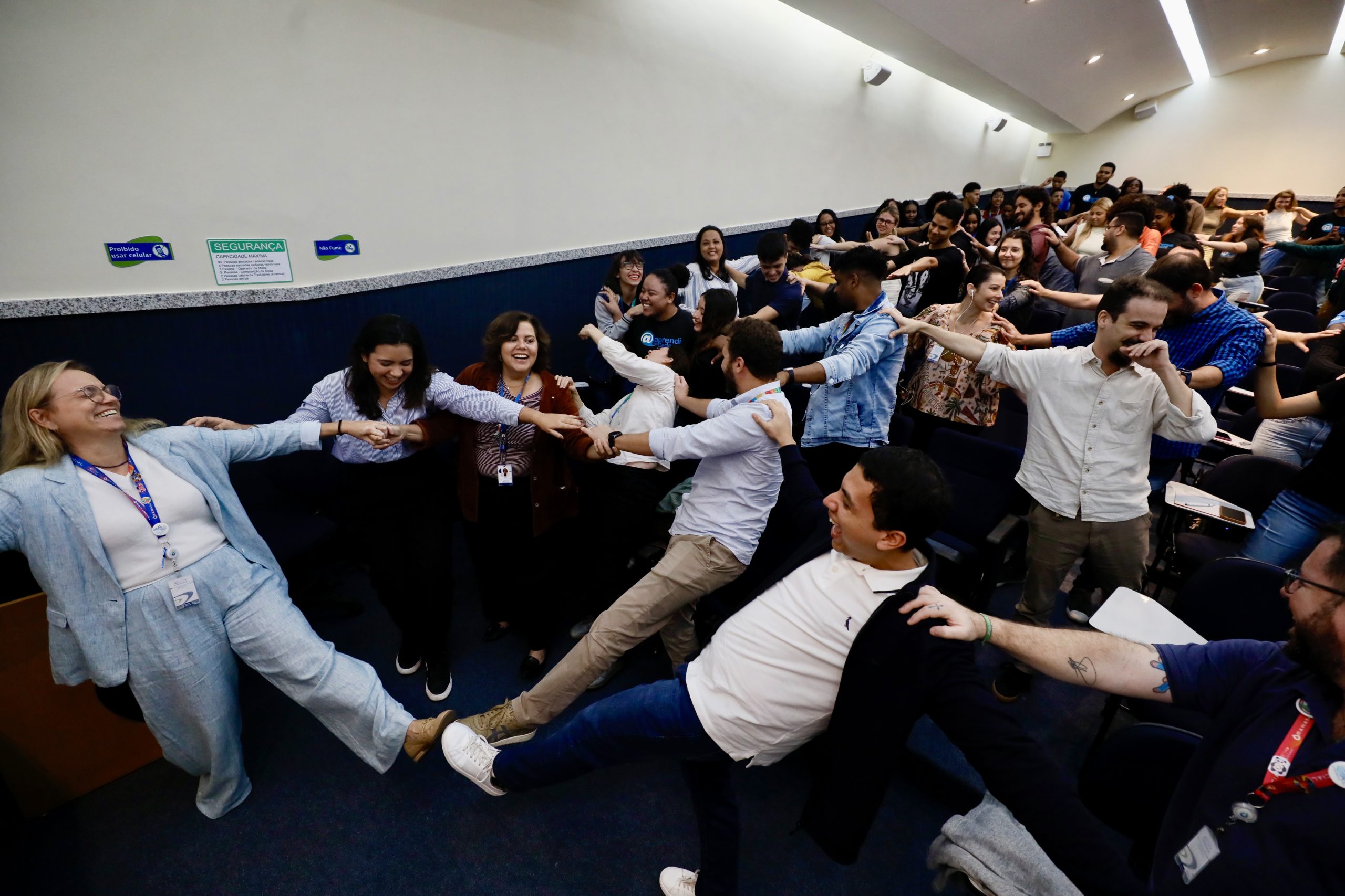Ainda, o evento contou com uma dinâmica de conexão entre os presentes por meio de gestos, utilizando o tato, proposta por Marcus Barão. Na atividade, o público deveria colocar a mão no ombro de quem estivesse ao lado e alcançar um terceiro colega com o pé. Para mais fotos, acesse aqui.