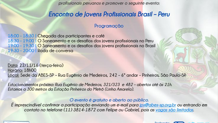 O programa Jovens Profissionais do Saneamento da ABES-SP (JPS-SP), coordenado por Thomas Ficarelli, promoverá, no dia 22 de novembro, às 18h, o Encontro de Jovens Profissionais Brasil – Peru.