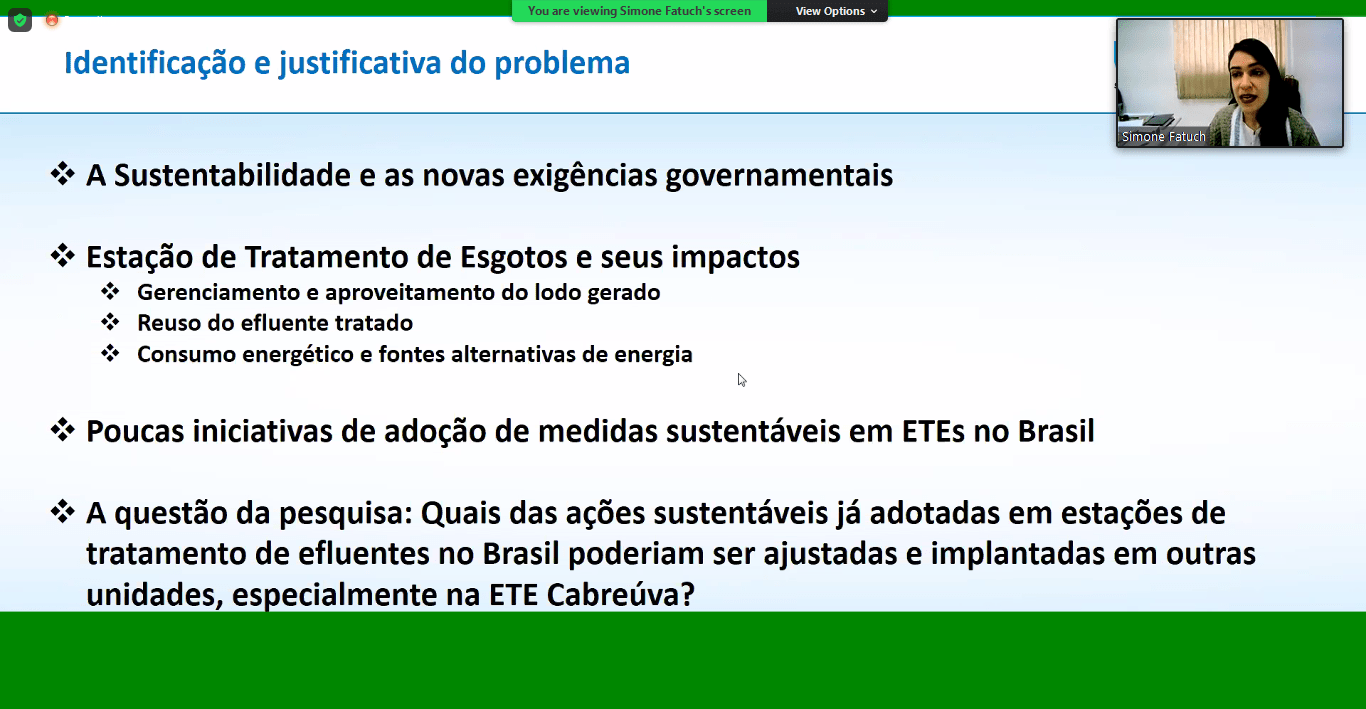 Em seguida, foi a vez de Silene Cristina Baptistelli apresentar o projeto “Rio Pinheiros: passado, presente e o futuro de um importante rio urbano na cidade de São Paulo”. Por fim, Simone Lara Fatuch de Oliveira exibiu o estudo “Planejando uma estação de tratamento de esgotos sustentável: mapeamento de ações sustentáveis no brasil para estudo de caso da ETE Cabreúva”.