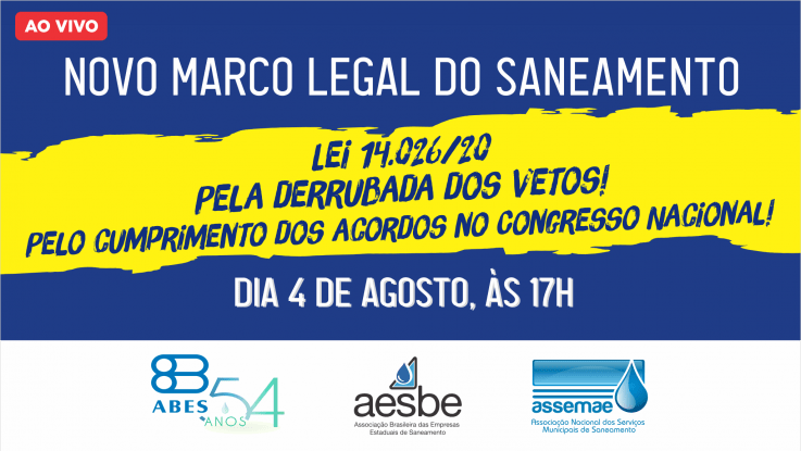 A Associação Brasileira de Engenharia Sanitária e Ambiental – ABES, a Associação Brasileira das Empresas Estaduais de Saneamento – AESBE e a Associação Nacional dos Serviços Municipais de Saneamento – Assemae promoverão, no dia 4 de agosto, às 17h, uma mobilização online pela derrubada dos vetos do novo marco legal do saneamento e pelo cumprimento dos acordos no Congresso Nacional.