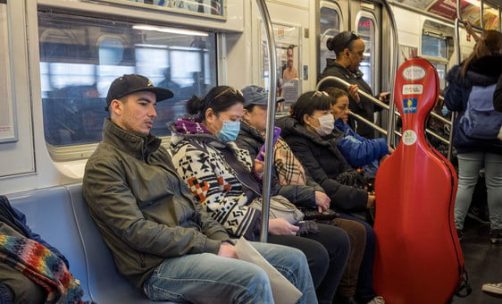 Passageiros usam máscaras em trem após registro do primeiro caso de coronavírus em Nova Iorque.
