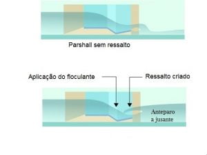 Para explicar o processo, Éverton destaca um trecho do livro “Hidráulica Aplicada às Estações de Tratamento de Água”, do Professor Marcos Rocha Vianna. “Como está explicado em seu livro, ‘o ressalto na calha Parshall precisa ser provocado, fazendo-se tentativas, aumentando-se a lâmina d’água no canal de jusante através de um artifício qualquer, utilizando, por exemplo, stop-logs, afogados ou não”, explica ele. O ressalto provoca uma distorção de energia relativamente grande. “Este fato, aliado ao estreitamento da garganta do medidor e à pequena lâmina d’água na garganta, torna relativamente homogênea a aplicação do coagulante na massa líquida, permitindo que a mistura rápida seja efetuada de forma bastante próxima à ideal, do ponto de vista das condições que devem prevalecer nessa fase de tratamento’, cita.