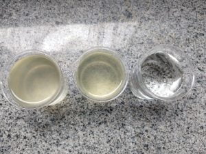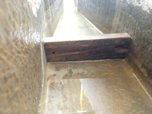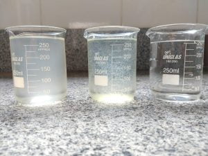 “O que acontecia em nossa estação era que dosávamos o floculante, porém não obtínhamos resultados satisfatórios. Para que ocorresse uma boa floculação, precisávamos dosar uma grande quantidade de floculante, porém estava ficando inviável o tratamento (falando financeiramente)”, conta Éverton. “Com a aplicação do ressalto, diminuímos o consumo de floculante e melhoramos a floculação, (como pode ser visto nas fotos abaixo). Um resultado impressionante, que com um insignificante custo (um pedaço de madeira que estava empilhado na estação e serviu de stop-log) consegui reduzir o consumo de floculante e melhorar a turbidez da água tratada. Água que é utilizada no processo de limpeza dos tecidos”, detalha.