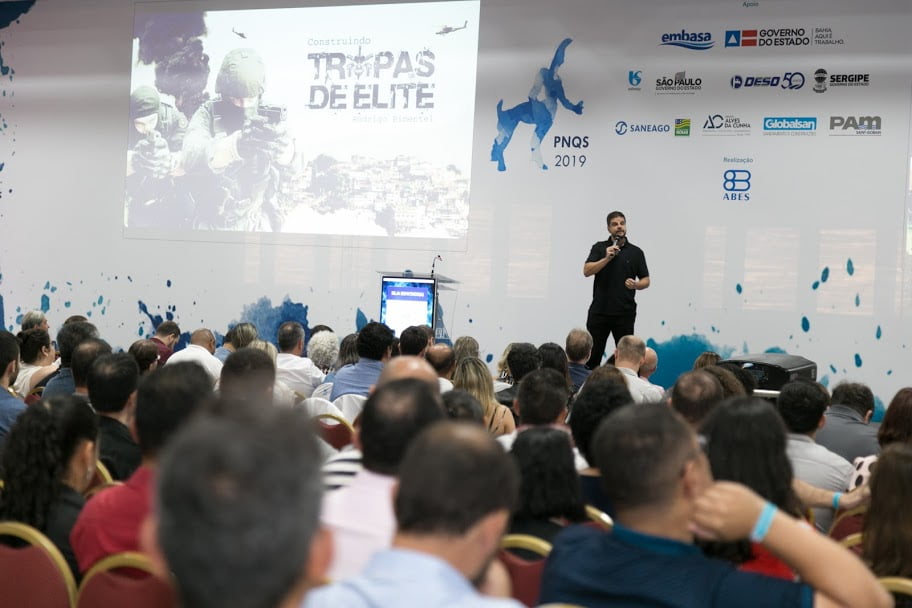 Já que realizar o saneamento no Brasil não é tarefa fácil, o PNQS 2019 trouxe nesta sexta, 29 de novembro, último dia do evento, o sociólogo e ex-capitão do BOPE Rodrigo Pimentel, criador do filme “Tropa de Elite”, para ministrar a palestra “Construindo Tropas de Elite” no encerramento do 22º Seminário Benchmarking. A proposta da palestra foi mostrar como se constroi equipes de alta performance, capazes de obter resultados, superar desafios e se autogerenciar e se automotivar. Fazendo uma analogia entre a realidade do BOPE e a das empresas de saneamento, Pimentel falou dos princípios das operações especiais, que podemos aplicar nas empresas: planejar com simplicidade, treinar à exaustão, observar os fatores de segurança, executar com rapidez e determinação e sempre avaliar como foi a “missão”. Também ressaltou que o reconhecimento para uma equipe de elite é imprescindível pois uma equipe de alta performance trabalha focada em um objetivo maior, uma missão nobre. Interagindo com a platéia, perguntou se os líderes elogiam seus subordinados e disse que esse é o primeiro passo se quiserem estabelecer uma relação de confiança com a equipe. Destacou que a missão dos sanitaristas é tão nobre quanto à dos profissionais de segurança pública, pois ambos buscam preservar a vida.