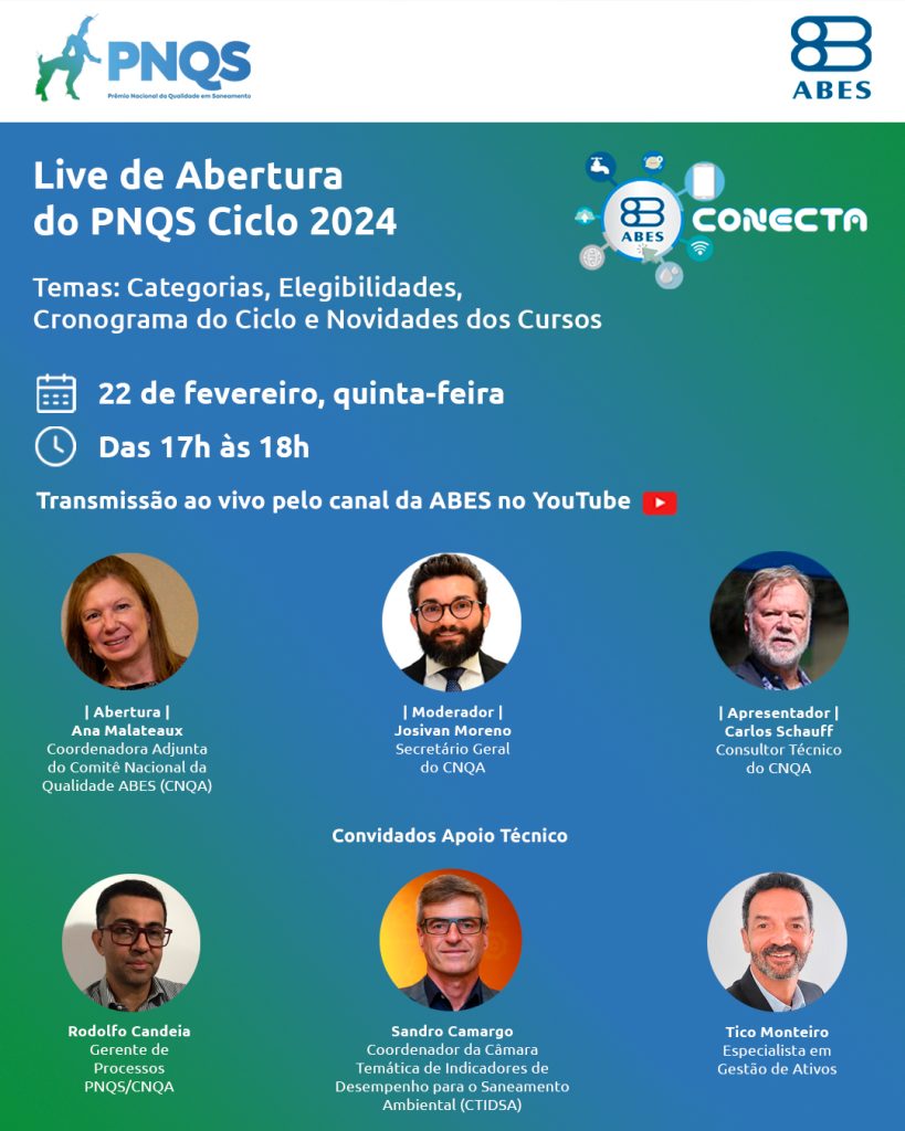 Assista ao evento ao vivo no canal da ABES no YouTube e fique por dentro das novidades da edição deste ano do Prêmio Nacional da Qualidade em SaneamentoS – O Oscar do setor no Brasil. Clique aqui para se inscrever!