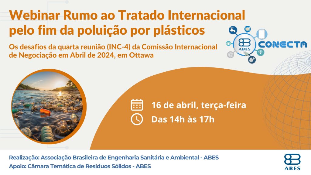 Em 16 de abril, a Associação Brasileira de Engenharia Sanitária e Ambiental – ABES, com apoio de sua Câmara Temática de Resíduos Sólidos, reunirá especialistas do setor de saneamento e representantes do governo e de organizações nacionais e internacionais no evento online “Rumo ao Tratado Internacional pelo fim da poluição por plásticos. Os desafios da quarta reunião (INC-4) da Comissão Internacional de Negociação em Abril de 2024, em Ottawa“. O webinar será transmitido ao vivo pelo canal da entidade no YouTube, das 14h às 117h. Saiba mais e inscreva-se aqui.
