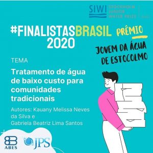 Kauany Melissa Neves da Silva e Gabriela Beatriz Lima Santos, com o trabalho: “Tratamento de Água de Baixo custo para comunidades tradicionais”, que apresenta uma solução para o acesso à água potável para áreas que sofrem com ausência de saneamento básico. A proposta é simples e inclusiva, fazendo com que comunidades mais carentes tenham água limpa e de boa qualidade para consumo, utilizando materiais existentes na própria localidade e com recurso de energia renovável (energia solar) o que faz o processo ser de baixo custo!!