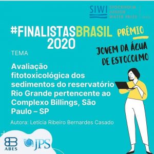 Letícia Ribeiro Bernardes Casado, com o trabalho “Avaliação fitotoxicológica dos sedimentos de reservatório Rio Grande pertencente ao Complexo Billings, São Paulo -SP”, que avalia se há alguma reação tóxica que prejudica o crescimento de sementes de pepino e mostarda em amostras de água coletada no reservatório Rio Grande do complexo Billings. Destaque para a importância do monitoramento na construção de dados para tomada de decisão pelos órgãos competentes.