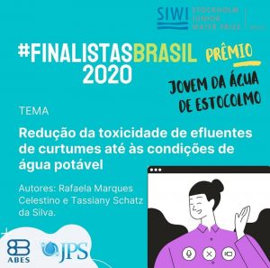 Rafaela Marques Celestino e Tassiany Schatz da Silva, com o trabalho “Redução da toxidade de efluentes de curtumes até às condições de água potável”, que apresenta uma solução para o tratamento de água efluente dos processos de produção de peles e couro conhecidos por curtume. A ideia é que o tratamento seja eficiente e econômico. Para o processo foi testado o uso de escamas de tilápias para a descontaminação e tratamento dos efluentes tóxicos oriundos do curtume!!