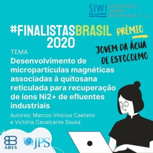 Marcos Vinícius Caetano e Victória Cavalcante Sousa, com o trabalho: “Desenvolvimento de micropartículas magnéticas associadas à quitosana reticulada para recuperação de íons Ni2 + de efluentes industriais. O projeto apresenta uma solução para a recuperação de Níquel no processo de descarte de efluentes industriais! A ideia de fazer essa recuperação é pensando na evolução da extração desse metal da natureza por conta da alta produção de veículos elétricos para os próximos anos.