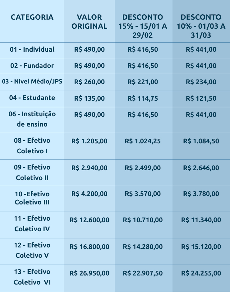 - A partir de 1 de abril: valor integral (no boleto à vista ou cartão de crédito, sem desconto, em até 6x sem juros).